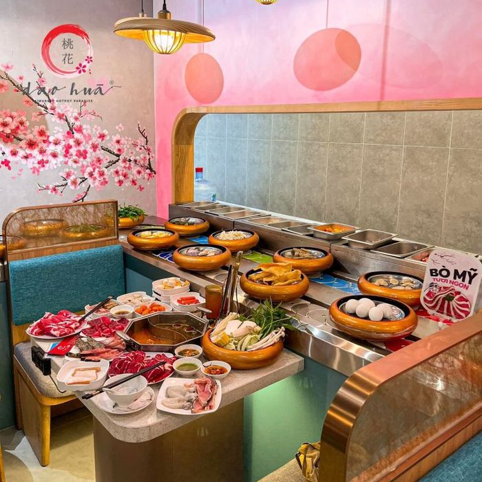 Dao Hua - Taiwanese Hotpot Paradise là điểm đến nổi bật của nền ẩm thực Đài Loan với mô hình lẩu băng chuyền độc đáo. Bạn sẽ được thưởng thức những món lẩu thơm ngon và đa dạng, từ lẩu Collagen, lẩu Malah Dao Hua đến lẩu Thái, lẩu nấm, lẩu Satay,... Dao Hua cũng gây ấn tượng mạnh mẽ với thực đơn hải sản tươi ngon: tôm, mực nang, bạch tuộc, ốc, nghêu, cá ba sa,... cùng các món thịt đậm đà như ba chỉ bò Mỹ, thăn bò, bắp bò,... Đặc biệt, với các món nhúng lẩu độc đáo như tim heo, trứng non, tôm hùm viên và sủi cảo, Dao Hua sẽ làm hài lòng những thực khách khó tính nhất. Cùng với không gian rộng rãi, thiết kế đậm chất Đài Loan, bạn sẽ cảm nhận được sự thoải mái khi thưởng thức món ăn tại đây.