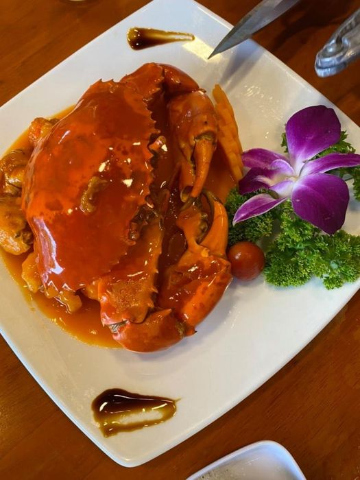 Sốt me đặc sánh, ngọt ngào mà không quá gắt, bao phủ trọn vẹn những con cua tươi ngon. Mỗi miếng cua ngọt thịt được hòa quyện với sốt me chua ngọt đầy quyến rũ, tạo nên một món ăn không thể chê vào đâu được. Cua rang me ở đây là sự kết hợp hoàn hảo giữa vị ngọt của cua và vị chua ngọt hài hòa của sốt, đem lại sự mãn nhãn cho thực khách. Đặc biệt, không gian lung linh dưới ánh đèn khối vuông làm món ăn thêm phần bắt mắt và hấp dẫn.