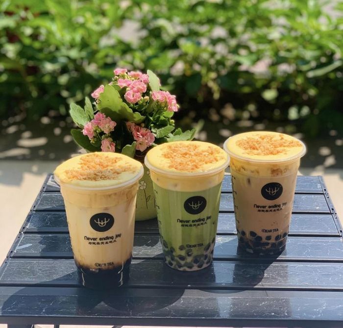 Dear Tea mang đến một thực đơn đa dạng, đầy đủ các loại trà sữa thơm ngon khiến các tín đồ trà sữa khó lòng cưỡng lại. Từ trà sữa Ô Long, trà sữa Thái, trà sữa Hong Kong cho đến món trà sữa kem phô mai béo ngậy dành cho các bạn gái không lo ngại về cân nặng, trà sữa sen hay trà sữa hoa lài thanh mát với vị trà thơm và sữa ngọt ngào. Trà sữa tại quán có độ ngọt vừa phải, dễ uống, và giá thành lại rất hợp lý, khiến bạn có thể thưởng thức một ly trà sữa to với trân châu dẻo dai mà không phải lo về giá cả. Món trà sữa ở đây mang đến sự hài hòa giữa vị trà nhẹ nhàng và sữa thơm mịn, không béo ngậy như nhiều nơi khác, phù hợp với những ai yêu thích trà sữa nhưng lại lo ngại về cân nặng.