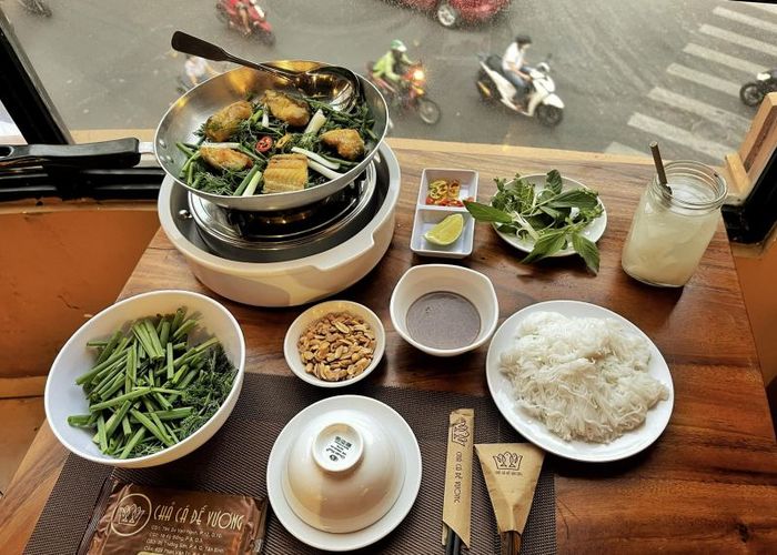 Không gian quán rộng rãi, sạch sẽ, rất phù hợp cho những buổi tụ họp bạn bè hay gia đình. Chả Cá Đế Vương không chỉ làm say lòng thực khách bởi hương vị tinh tế mà còn gợi nhắc về một Hà Nội xưa cũ, nơi lưu giữ ký ức và cảm xúc. Những lát cá được tẩm ướp theo công thức truyền thống, áp chảo vàng đều, ăn kèm bún tươi, rau sống và chút mắm tôm, như tái hiện đầy đủ tinh hoa ẩm thực đất Bắc giữa phố thị phương Nam.