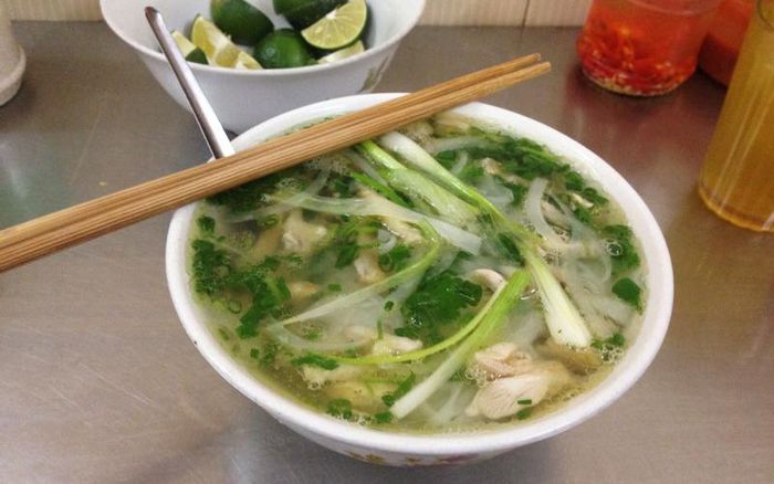 Bên cạnh phở trộn, bạn đừng quên thử phở gà nước. Phở gà nước có các lựa chọn như phở đùi, phở cánh, phở lườn, hay phở xé – bạn có thể chọn theo sở thích. Nước phở ngọt thanh từ xương gà, xương ống hầm nhiều giờ, khi nếm thử sẽ lan tỏa một cảm giác ấm áp, dễ chịu. Thêm vài lát chanh và một ít quẩy giòn là bạn sẽ cảm thấy trọn vẹn hương vị. Quán nằm ngay ngã tư Phủ Doãn giao với Hàng Bông, rất dễ tìm, với không gian thoáng mát, có cả khu vực vỉa hè và trong nhà. Điều hòa nhẹ nhàng trong nhà tạo cảm giác dễ chịu cho thực khách.