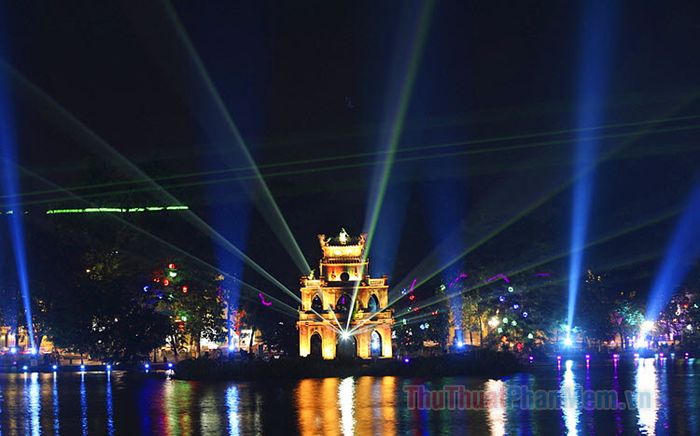 Hình ảnh đêm Hồ Gươm tráng lệ, tái hiện vẻ đẹp cổ kính và hiện đại giữa lòng thủ đô.