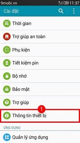 Tương tự như khi thêm tài khoản Google, đầu tiên bạn hãy vào mục Cài đặt - Setting và chọn Thông tin thiết bị (1) như hình minh họa dưới đây.