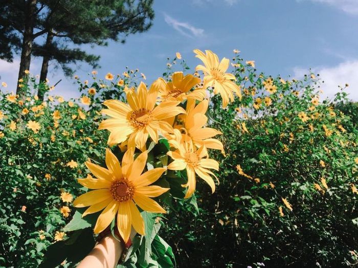 Những bông hoa dã quỳ mọc ven đường hay trên những ngọn đồi xanh ngắt, như một dòng suối vàng tràn đầy sức sống. Chúng có sức hút kỳ lạ, làm say đắm bao du khách. Chạy dọc theo những cung đường uốn lượn từ Liên Khương vào Đà Lạt, bạn sẽ không thể rời mắt khỏi sắc vàng rực rỡ của hoa dã quỳ. Hoa mọc ven đường, bám trên các sườn đồi, trông như một dải lụa vàng óng ánh, đẹp đến ngỡ ngàng.