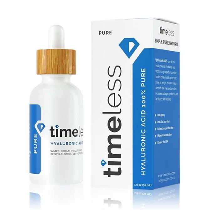 - Timeless Hyaluronic Acid Serum 100% Pure chứa 1% Hyaluronic Acid, giúp da giữ nước gấp 1000 lần trọng lượng của nó, đem lại hiệu quả dưỡng ẩm tuyệt vời cho cả da khô và da dầu thiếu nước mà không gây nhờn rít.