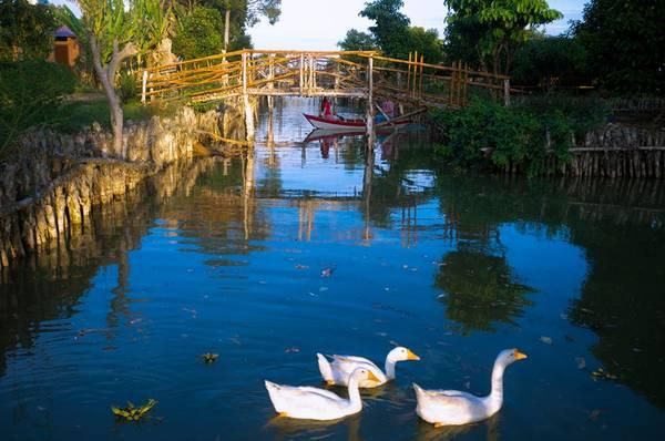 Đặt chân đến khu du lịch, du khách sẽ cảm nhận được vẻ đẹp hoang sơ, mộc mạc của một miền quê yên bình. Những chòi lá xinh xắn nằm giữa hồ nước trong vắt, được nối liền với đất liền qua những cây cầu gỗ, tạo nên không gian thư giãn tuyệt vời. Dạo quanh khu du lịch, bạn như lạc vào những miệt vườn của làng quê, với tiếng chim hót, tiếng gà gáy, tiếng ếch nhái vang vọng xung quanh. Bên hồ, đàn vịt, ngỗng, ngan lội bơi, trên bờ xa xa, đàn trâu chầm chậm gặm cỏ tạo nên một khung cảnh thanh bình, giúp du khách tìm lại cảm giác thư thái, yên bình sau những ngày làm việc căng thẳng.