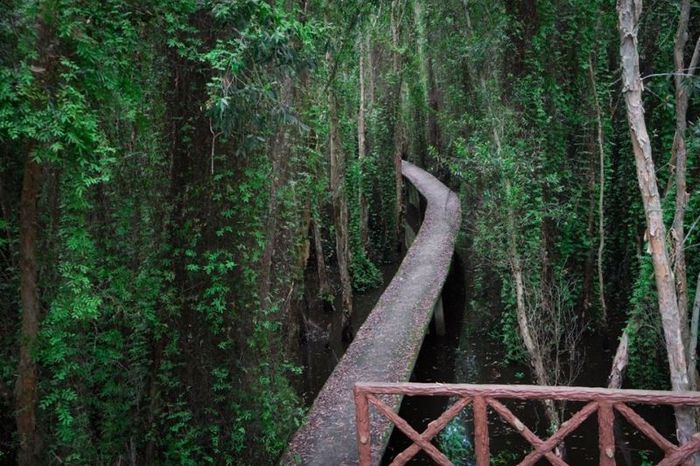 Điều đặc biệt thu hút du khách là con đường xuyên rừng dài hơn 5km, nơi du khách có thể tản bộ, ngắm nhìn vẻ đẹp của khu rừng và cảm nhận sự tĩnh lặng của thiên nhiên. Con đường này dẫn qua những thảm cây xanh, nơi con người trở nên nhỏ bé giữa rừng tràm bạt ngàn, tạo nên một bức tranh thiên nhiên tuyệt đẹp. Ngoài ra, còn có đài quan sát cao 38m với 10 tầng, cho phép du khách ngắm nhìn toàn cảnh rừng tràm và vùng đất ngập nước xung quanh.