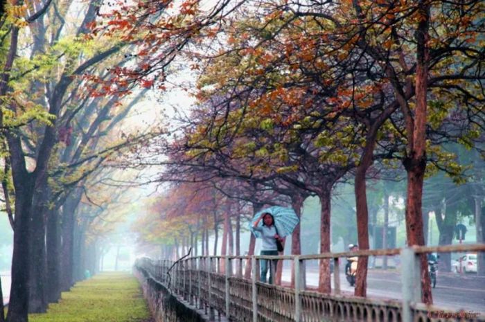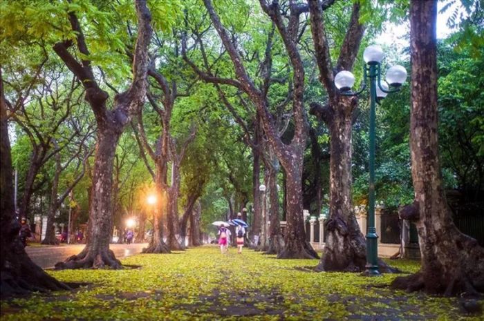 Đường Phan Đình Phùng là một trong những con đường nên thơ và lãng mạn bậc nhất của thủ đô, nơi mang trong mình vẻ đẹp bất biến qua từng mùa. Hai hàng cây sấu cổ thụ thẳng tắp, cao vút như dệt nên mái vòm xanh mướt, khiến bước chân qua đây luôn như lạc vào một thế giới thanh bình và yên ả.
