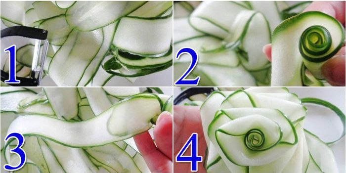 Cuộn miếng dưa leo thành hình dạng nụ hoa hồng chưa nở, sau đó lật ngược miếng dưa và tiếp tục cuộn thêm, lặp lại thao tác này với những miếng dưa khác cho đến khi tạo thành bông hoa hoàn chỉnh.