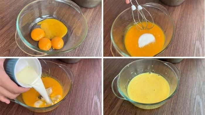 Trong một tô lớn, bạn cho vào 4 lòng đỏ trứng, 25g đường, ¼ muỗng cà phê muối, và 4ml vani, rồi trộn đều. Sau đó, cho thêm 30 ml dầu thực vật, 50 ml sữa tươi vào và tiếp tục trộn đều cho hỗn hợp mịn màng.