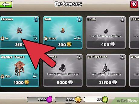 Hãy vào cửa hàng (Shop) và chọn các công trình phòng thủ trong phần "Defense" (Phòng thủ). Những công trình phòng thủ hiệu quả ban đầu bao gồm tường (Wall) và súng cối (Mortar). Xây dựng những công trình này sẽ giúp bạn bảo vệ căn cứ, ngăn chặn kẻ thù đánh cắp vàng và Elixir. Hãy nâng cấp tường càng sớm càng tốt, đặc biệt là lên cấp độ 3 để tăng khả năng phòng thủ.