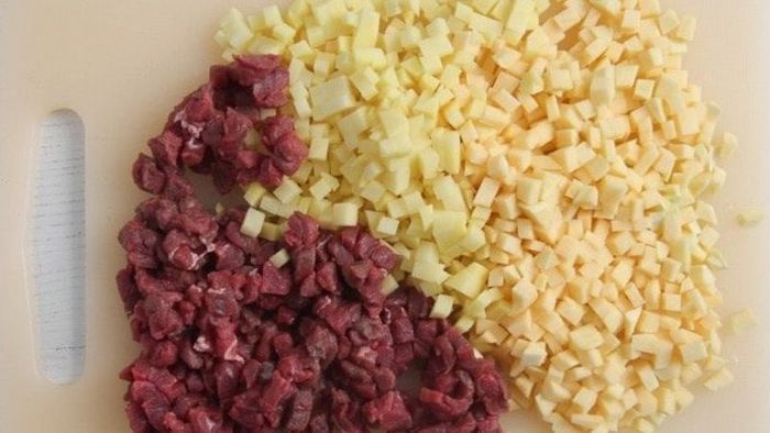 Sơ chế và chuẩn bị nguyên liệu tươi ngonKhoai tây, hành tây và củ rutabaga sau khi mua về hãy gọt vỏ, rửa sạch và cắt thành hạt lựu đều nhau.