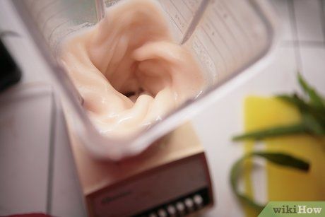 Cắt một vài nhánh lô hội tươi. Loại bỏ lớp vỏ xanh bên ngoài, sau đó thái lô hội thành những miếng nhỏ. Cho toàn bộ phần gel lô hội vào máy xay.