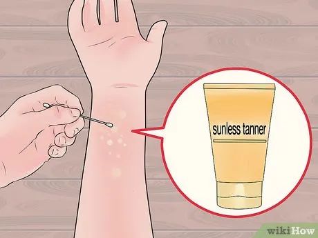 Thoa sản phẩm làm nâu da lên các đốm trắng. Các đốm này xuất hiện do thiếu sắc tố, vì vậy sử dụng sắc tố nhân tạo có thể giúp chúng hòa lẫn với vùng da xung quanh.
