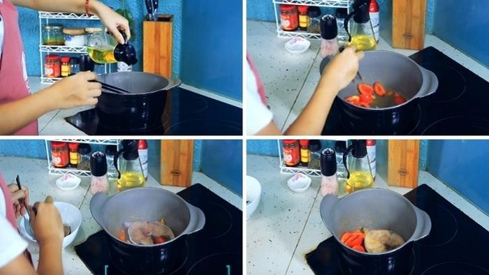 Cho một ít dầu ăn vào nồi, đợi dầu nóng rồi cho hành tím vào phi thơm. Tiếp theo, cho cà chua và cá vào, đảo đều cho các nguyên liệu hòa quyện.