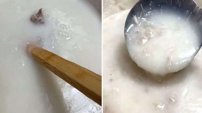 Đầu tiên, vớt bỏ lớp váng mỡ nổi trên mặt nước hầm, sau đó cho phần bột đã ngâm vào và khuấy đều tay.