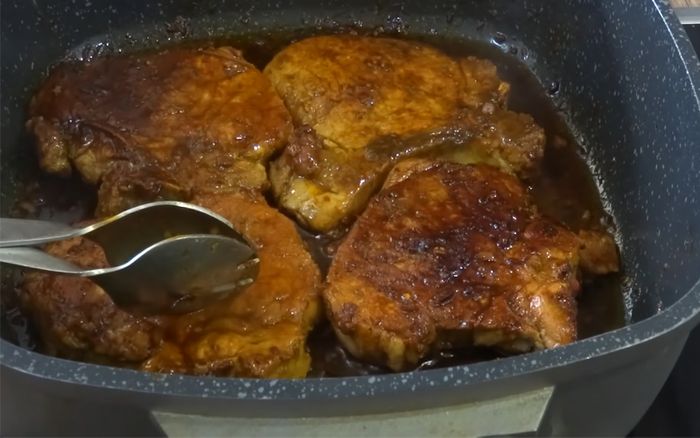 Chiên sườn với lửa nhỏ cho đến khi thịt chín và có màu vàng nâu đẹp mắt, sau đó tắt bếp.