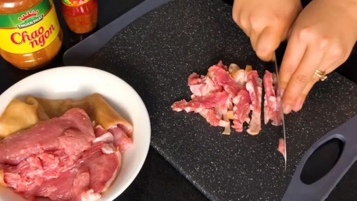 Cắt thịt thành miếng vừa ănSau khi rửa sạch, đậu bắp được cắt bỏ cuống, sau đó cắt đôi từng trái. Cà tím cắt thành những lát dày khoảng 2-3 cm. Bên cạnh đó, bạn cũng băm nhuyễn 3-4 củ tỏi và 1 cây sả để chuẩn bị cho công đoạn ướp thịt.