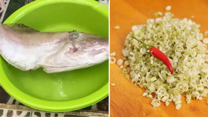 Ớt bạn cần cắt nhỏ và băm nhuyễn, trong khi sả sẽ được chia làm hai phần: một phần băm nhuyễn, phần còn lại cắt khúc vừa ăn.