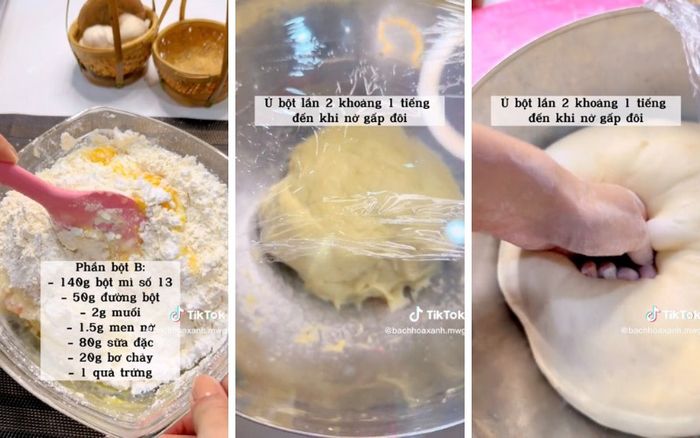 Thêm vào phần bột đã ủ: 140g bột mì số 13, 50g đường bột, 2g muối, 1,5g men nở, 80g sữa đặc, 20g bơ chảy, 1 quả trứng. Nhào kỹ bằng tay hoặc máy trong 15 - 20 phút cho đến khi bột dẻo mịn và kéo được màng mỏng.