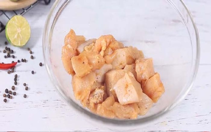 Sơ chế thịt gà thật kỹ càngSau khi mua về, bạn hãy rửa sạch thịt gà rồi thái thành từng lát mỏng hoặc miếng vuông nhỏ. Có thể dùng muối để rửa ức gà, giúp loại bỏ tạp chất, sau đó để ráo.
