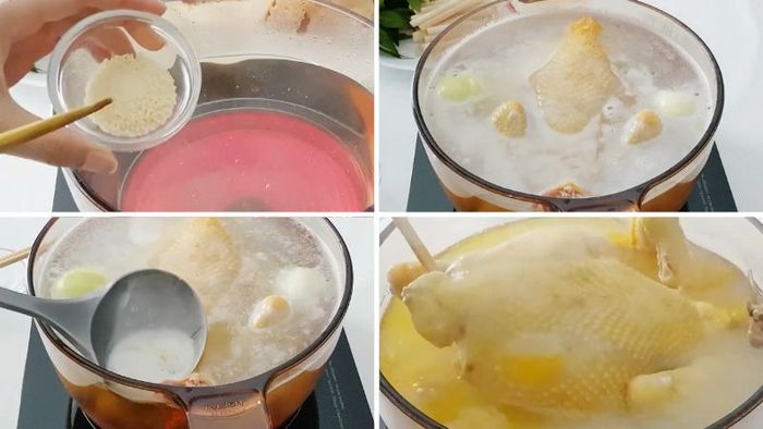 Cho 2 muỗng cà phê hạt nêm cùng với 2 củ hành tây vào nồi nước đang sôi, sau đó cho gà vào luộc. Luôn nhớ vớt bọt khi cần. Luộc trong khoảng 35 phút, khi dùng đũa đâm vào thịt thấy nước thịt không còn chảy ra, tắt bếp. Vớt gà ra và ngâm qua nước lạnh để thịt gà nguội hẳn.