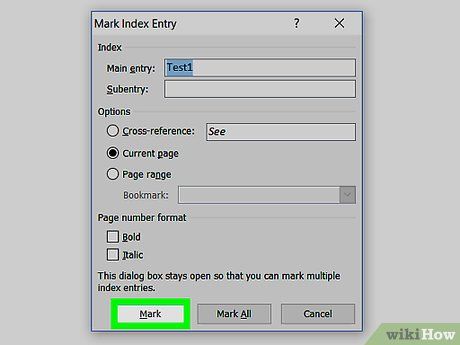 Nhấp vào Mark (Đánh dấu). Nút này sẽ đánh dấu thuật ngữ được chọn và thêm vào chỉ mục cùng với số trang tương ứng.
