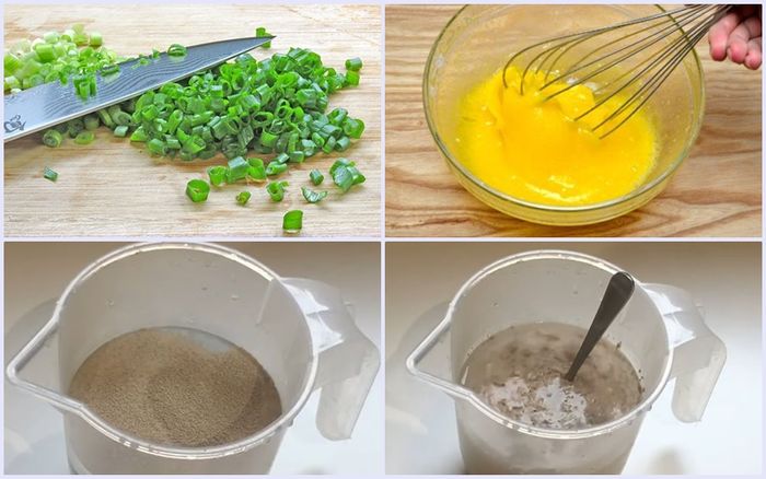 Chuẩn bị các nguyên liệu cần thiết cho món bánh.Rửa sạch hành lá, sau đó thái nhỏ.