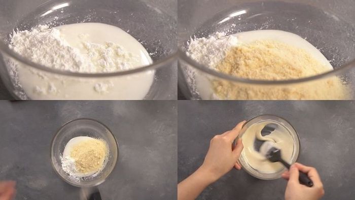 Cho 30g sữa chua, 15g bột cốt dừa và 8g tinh bột ngô vào tô, sau đó khuấy đều cho đến khi tất cả hòa quyện hoàn hảo.