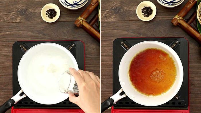 Bắt đầu bằng cách đun 90g đường và 110ml nước với lửa vừa, để yên, không khuấy. Đun cho đến khi hỗn hợp chuyển màu cánh gián (caramel), rồi cho thêm 70ml nước sôi vào. Tiếp tục đun sôi để nước và đường hoà quyện với nhau. Cẩn thận đừng để cháy quá, sẽ làm mất màu sắc đẹp của món bún chả.
