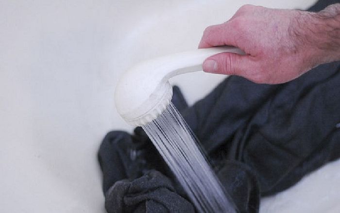 Dùng vòi sen hoặc nước để xả sạch nước giặt còn lại trên áoBước 4 Dùng vòi sen hoặc nước sạch để xả hết nước giặt trên áo. Nhẹ nhàng bóp áo bằng tay, tránh vặn hay xoắn để áo không bị mất dáng.
