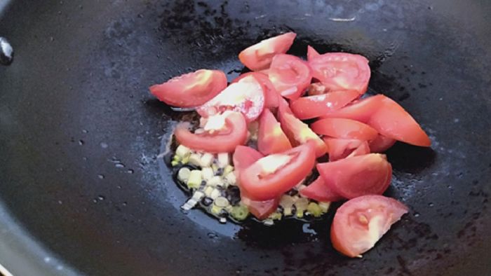 Phi thơm và xào cà chuaLàm nóng dầu trong chảo, cho gốc hành và gừng băm vào phi thơm dậy mùi. Sau đó cho cà chua vào, đảo đều tay đến khi cà chua chín mềm, tạo màu đẹp mắt.