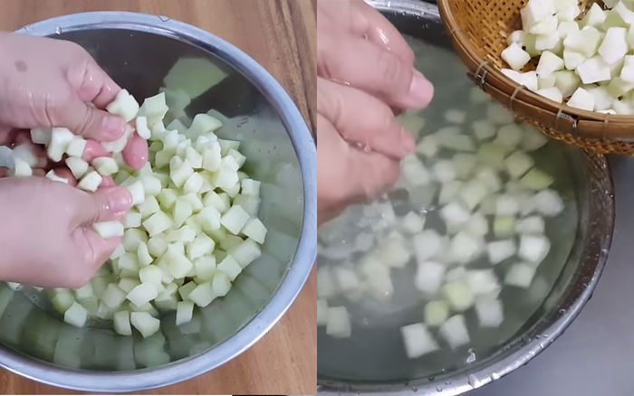 Sau khi đã cắt hạt lựu cùi bưởi, thêm vào khoảng 2 muỗng canh muối và 1 chén nước để bóp cùi bưởi, giúp giảm bớt vị đắng. Hãy nhớ bóp đều tay và kiên nhẫn trong khoảng 10 phút. Ngoài ra, bạn có thể tham khảo cách nấu chè bưởi không bị đắng.