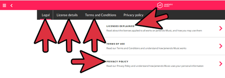 Các thông tin pháp lý trên trang Jamendo.Pháp lýChi tiết giấy phépĐiều khoản và Điều kiệnChính sách bảo mậtChi tiết giấy phép