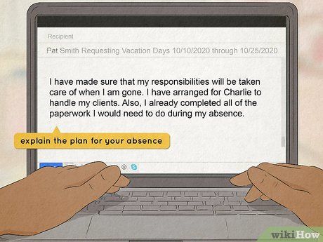 - Ví dụ, bạn có thể viết: “Tôi đã sắp xếp để chị Mai tiếp nhận công việc của tôi trong thời gian nghỉ phép. Tôi cũng đã hoàn thành các thủ tục quan trọng trước khi nghỉ.”
