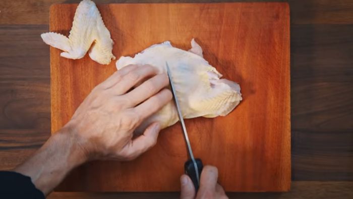 Gà sau khi mua về, bạn làm sạch, sau đó tách xương và cắt thịt thành từng miếng vừa ăn. Lưu ý để riêng thịt và xương ra.