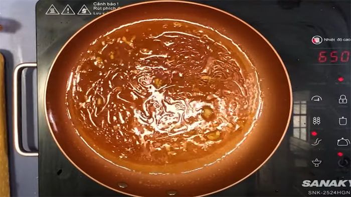 Đặt chảo lên bếp, cho dầu ăn vào rồi phi tỏi cho thơm. Sau đó, thêm vào 1 muỗng canh đường, ½ muỗng nước mắm, 1 muỗng tương ớt và nước me vào, đảo đều trong 5 phút để gia vị hòa quyện.