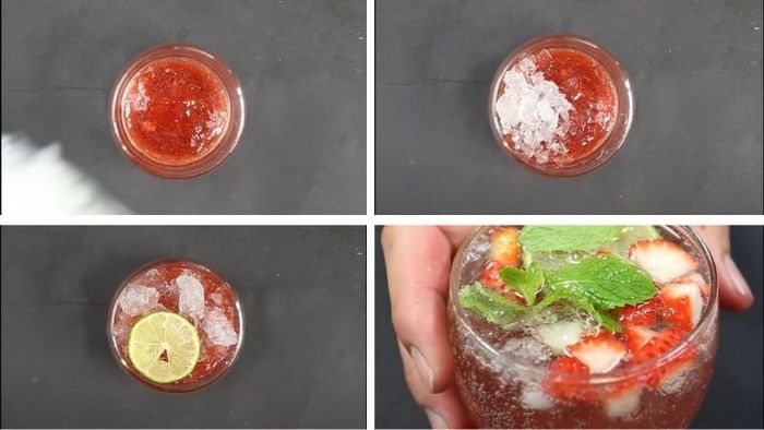 Đổ phần siro dâu đã nấu vào đáy ly, sau đó nhẹ nhàng đập vài lá bạc hà cho tỏa hương rồi thả vào. Cắt lát mỏng quả chanh và cho vào ly để tăng thêm vị chua thanh mát. Tiếp theo, thêm đá vào ly và đổ soda hoặc 7up vào, hòa quyện tất cả hương vị tươi mới.