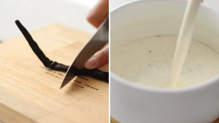 Cắt đôi trái vani theo chiều dọc và cạo lấy phần hạt vani bên trong, sau đó cho vào nồi. Tiếp theo, đổ 200g kem sữa béo và 100g sữa tươi không đường vào, đun ở lửa vừa, khuấy nhẹ nhàng cho đến khi hỗn hợp ấm lên thì tắt bếp.