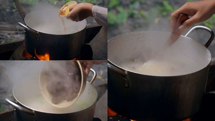 Đặt nồi lên bếp, cho 1 lít nước vào nồi cùng với gạo đã rang. Đun sôi trên lửa lớn, sau đó cho lòng bò đã luộc vào, nấu trong khoảng 20 phút.
