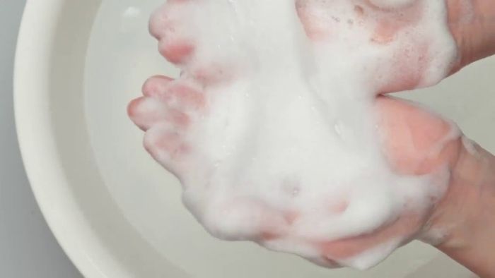 Bước 2 Làm ướt bánh xà phòng và nhẹ nhàng xoa vào lòng bàn tay để tạo bọt mịn.
