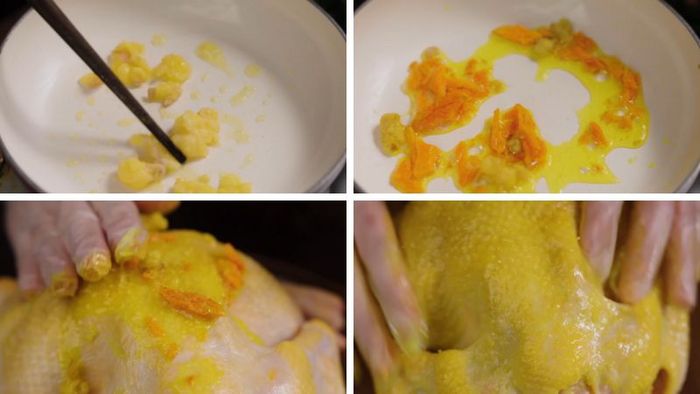 Bạn cho một ít mỡ gà vào chảo, sau đó thêm một chút nghệ và xào cho ra màu vàng đẹp mắt rồi tắt bếp. Tiếp theo, cho vào 1 muỗng cà phê đường và 1 muỗng cà phê hạt nêm, trộn đều cho gia vị thấm đều.