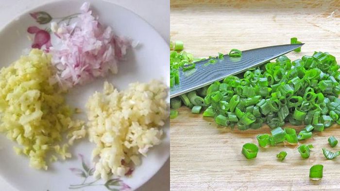 Tỏi, hành tím, gừng và hành lá rửa sạch, bóc vỏ. Tỏi, hành tím và gừng băm nhuyễn, hành lá thái nhỏ để sẵn.