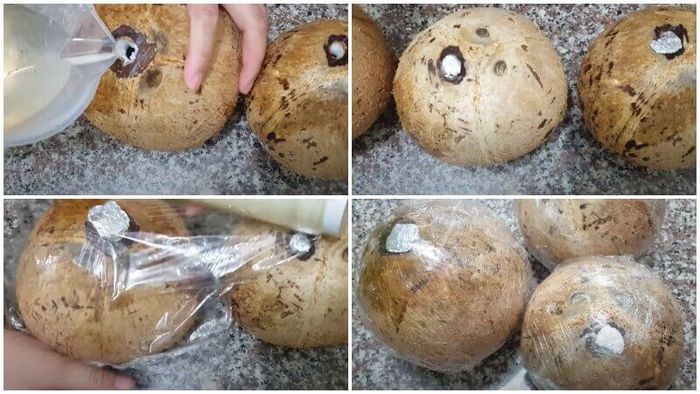 Sau khi khoét lỗ, bạn dùng giấy bạc và màng bọc thực phẩm để hàn kín lỗ lại.Rượu dừa sau khi hoàn thành và ủ đủ thời gian sẽ mang đến hương thơm đặc trưng, với cơm dừa hòa tan vào trong rượu, tạo nên một thức uống bổ dưỡng và tốt cho sức khỏe.