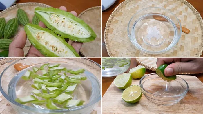 Khổ qua rửa sạch, cắt đôi và loại bỏ hạt. Sau đó, cắt thành những miếng nhỏ và ngâm trong nước muối loãng khoảng 10 phút. Chanh vắt lấy nước cốt để chuẩn bị cho bước tiếp theo.