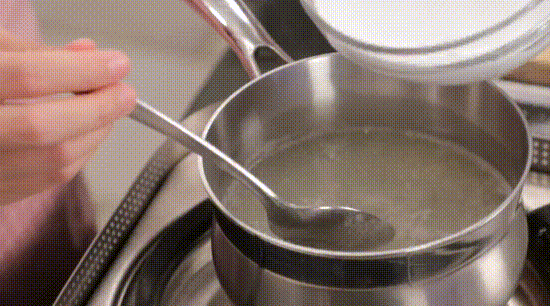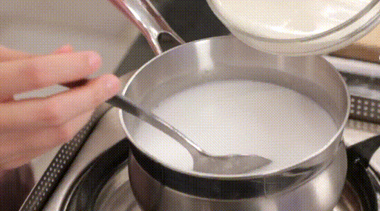 - Khi nước sôi, cho 180ml nước cốt dừa vào và tiếp tục khuấy đều.