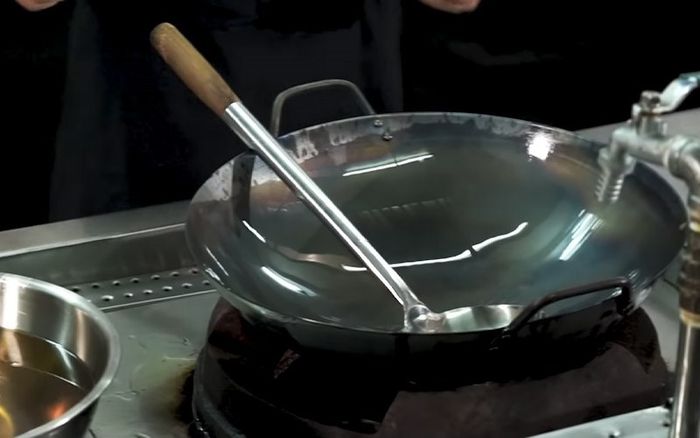 Bạn cho khoảng 3 muỗng canh dầu ăn vào chảo, sau đó nghiêng và xoay đều chảo để dầu phủ kín khắp lòng chảo. Hãy đun cho đến khi dầu bốc lên khói trắng rồi tắt bếp và để chảo nguội tự nhiên.