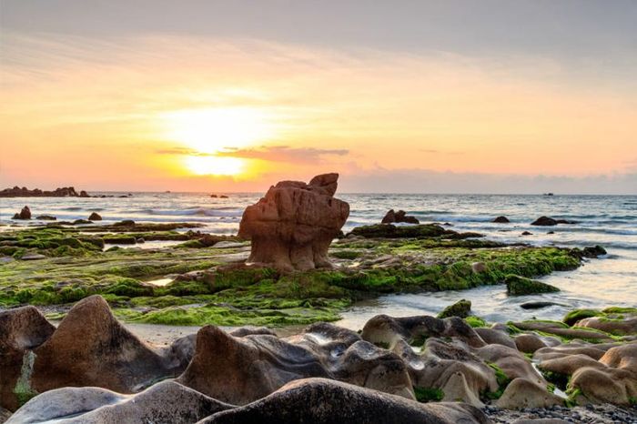 Thời điểm đẹp nhất để tham quan chính là vào giữa tháng 3, khi lớp rêu xanh bao phủ trên các khối đá, tạo nên khung cảnh tuyệt vời như một chốn tiên cảnh. Chắc chắn bạn sẽ có những bức ảnh cưới tuyệt đẹp, độc đáo và không kém phần lãng mạn. Biển Cổ Thạch không ồn ào như các địa điểm nổi tiếng khác, nên các cặp đôi có thể tận hưởng không gian riêng tư, tự do tạo dáng mà không bị làm phiền hay phải đợi chờ quá lâu.